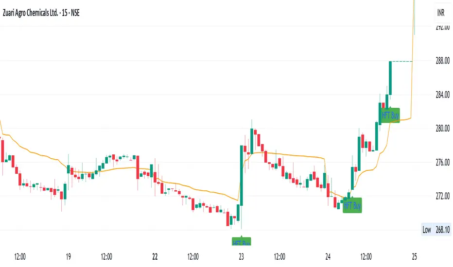 This script is designed to detect potential High-Frequency Trader (HFT) activity based on unusual volume spikes and candle behavior, in order to identify potential intraday breakout opportunities. It is best suited for 3-minute and 5-minute charts across NSE-listed stocks.