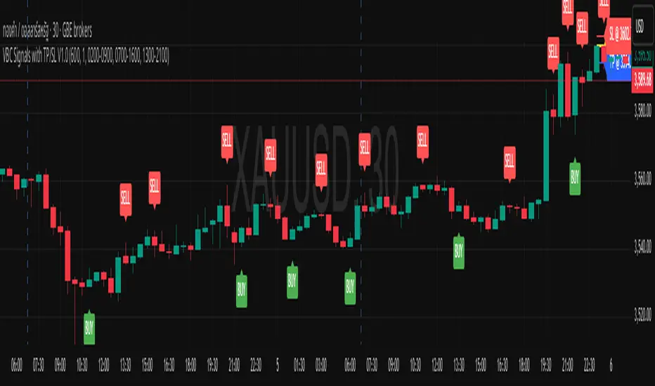 VBC has a very simple idea. It uses the principle that if the price of the XAUUSD asset rises above a specified range of at least 600 points (configuarable) continuously, and a candle breaks the upward trend, a signal will be generated to sell. The entry principle is to enter at the price at the last bullish candle with TP300 SL300.