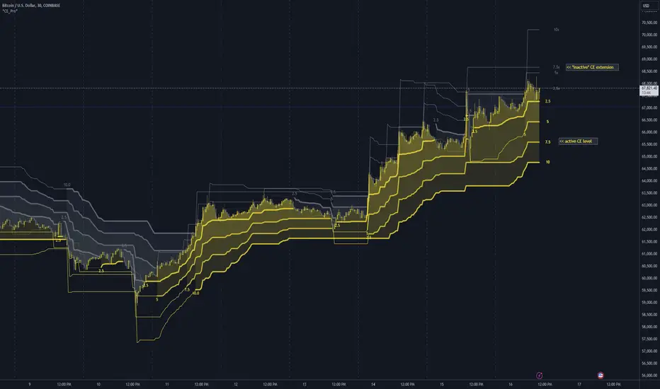 The Chandelier Exit Pro w/Extensions indicator is designed to assist traders in managing risk and identifying trend reversals. The strategy is based on the Chandelier Exit concept, originally created by Charles Le Beau. It uses the Average True Range (ATR) to calculate dynamic stop levels that adjust based on market volatility. This script not only implements the standard Chandelier Exit, but also introduces extension levels and alerts to enhance decision-making.