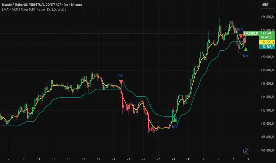 The EMA × MOST Cross indicator combines the Exponential Moving Average (EMA) with the Moving Stop (MOST) system to identify early trend reversals and confirm trend continuation phases.