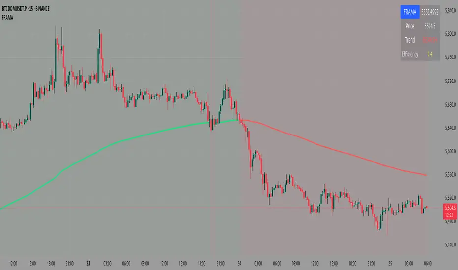 Information Table: Shows current FRAMA value, price, trend direction, and efficiency ratio