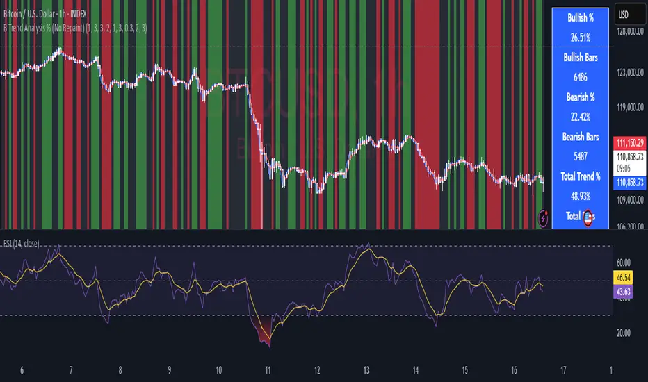 B Trend Analysis % is a no-repaint indicator that identifies bullish, bearish, or mean-reverting market phases using confirmed (prior-bar) signals from SMA crossovers, ADX trend strength, Supertrend direction, and optional RSI filtering. It visualizes trends via background colors (green for bullish, red for bearish, gray for mean-reversion) and provides a stats table showing bullish/bearish percentages over the chart's history.