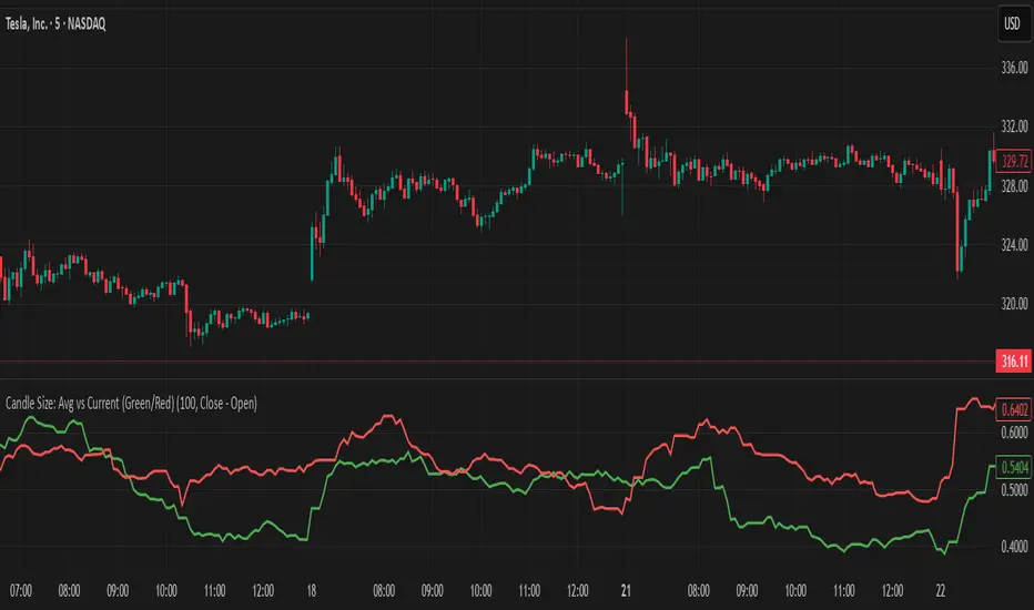 This indicator shows the size of green (bullish) and red (bearish) candles, either as an average over time or just the current candle. You can choose to measure candle size by the body (Close - Open) or the full range (High - Low). It's a simple way to compare recent buying vs. selling strength and spot shifts in momentum.