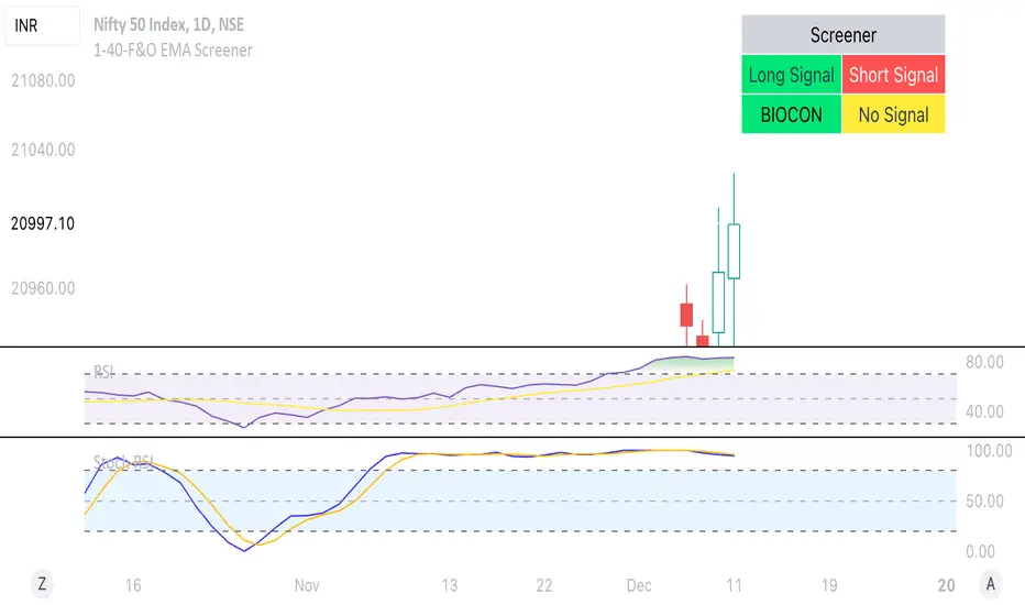 This Pine Script is a TradingView indicator named "1-40-F&O EMA Screener." It calculates and displays four moving averages (MA1, MA2, MA3, and MA4) and the Relative Strength Index (RSI) on a chart. The script generates buy and short signals based on certain conditions involving the moving averages and RSI. Additionally, it includes a screener section that displays a table of symbols with buy and short signals.Here's a breakdown of the key components: