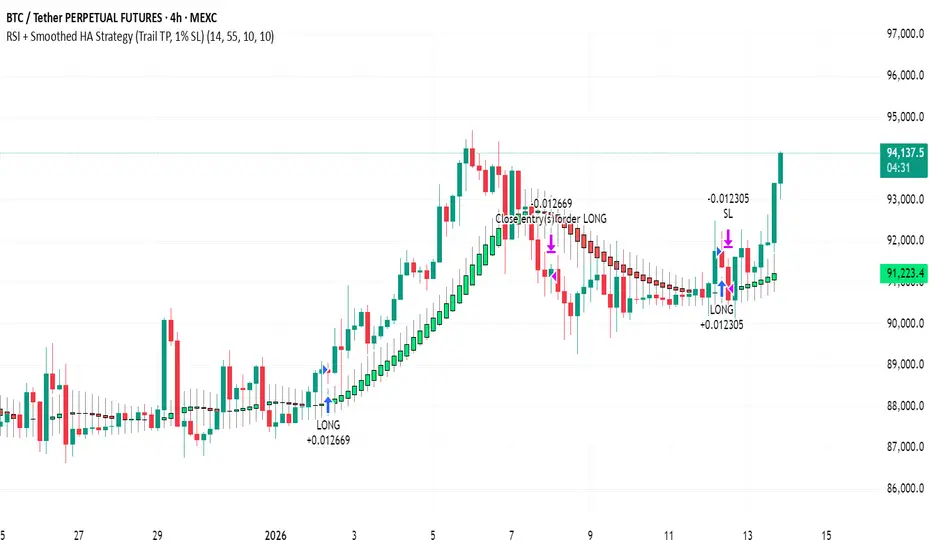 🚀 RSI + SMOOTHED HEIKEN ASHI STRATEGY (TRAILING TP, 1% SL) 📊