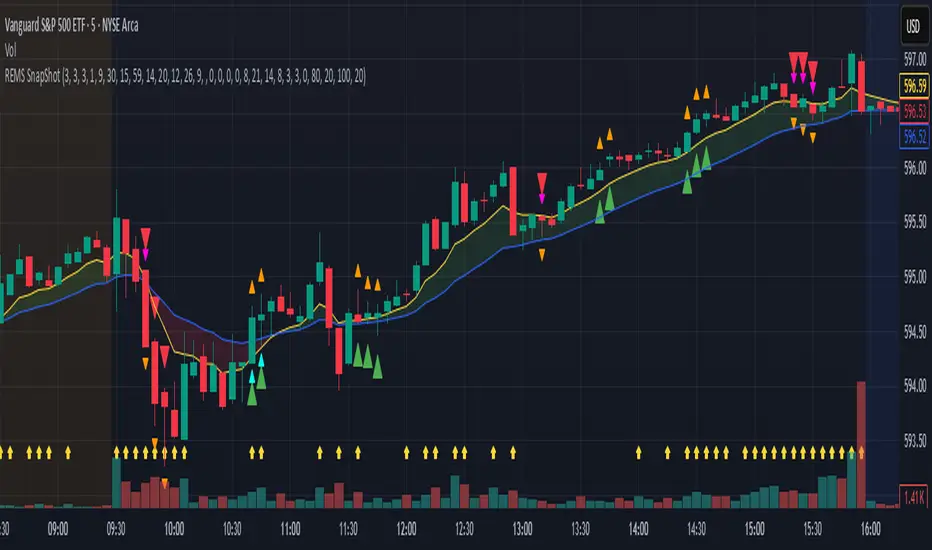 The REMS Snap Shot indicator is a multi-factor, confluence-based system that combines momentum (RSI, Stochastic RSI), trend (EMA, MACD), and optional filters (volume, MACD histogram, session time) to identify high-probability trade setups. Signals are only triggered when all enabled conditions align, giving the trader a filtered, visually clear entry signal.
