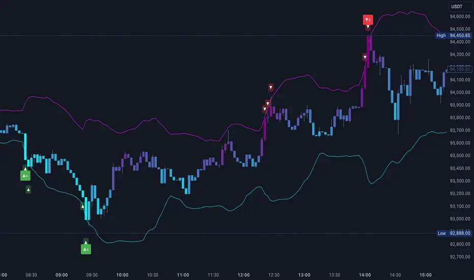 By factoring ATR into the band calculations, the script widens or narrows the thresholds during rapid market fluctuations. This reduces the amount of false triggers typically found in indicators that rely solely on fixed calculations, preventing overreactions to abrupt but short-lived price spikes.
