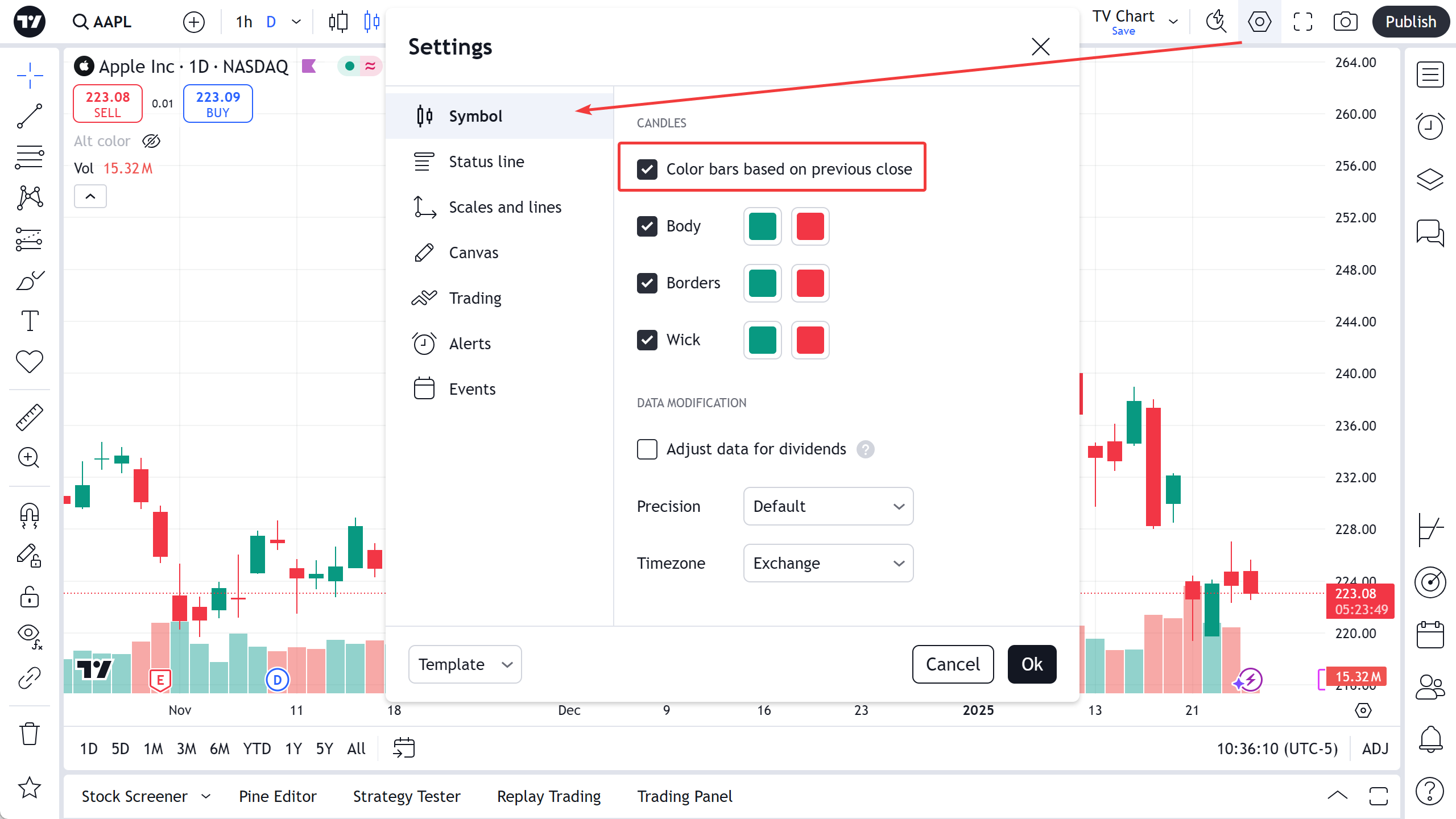 Falls manche Balken automatisch in einer entgegengesetzten Farbe gefärbt werden, dann ist es möglich, dass auf Ihrem Chart die Option „Balken basierend auf dem vorherigen Schließungspreis färben“ aktiviert ist. Sie können diese Option in den Chart-Einstellungen deaktivieren.