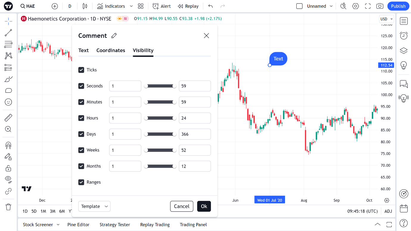 Im Dialogfenster für Sichtbarkeitseigenschaften können Sie die Anzeige des Texttools auf Charts mit unterschiedlichen Zeitrahmen einstellen: