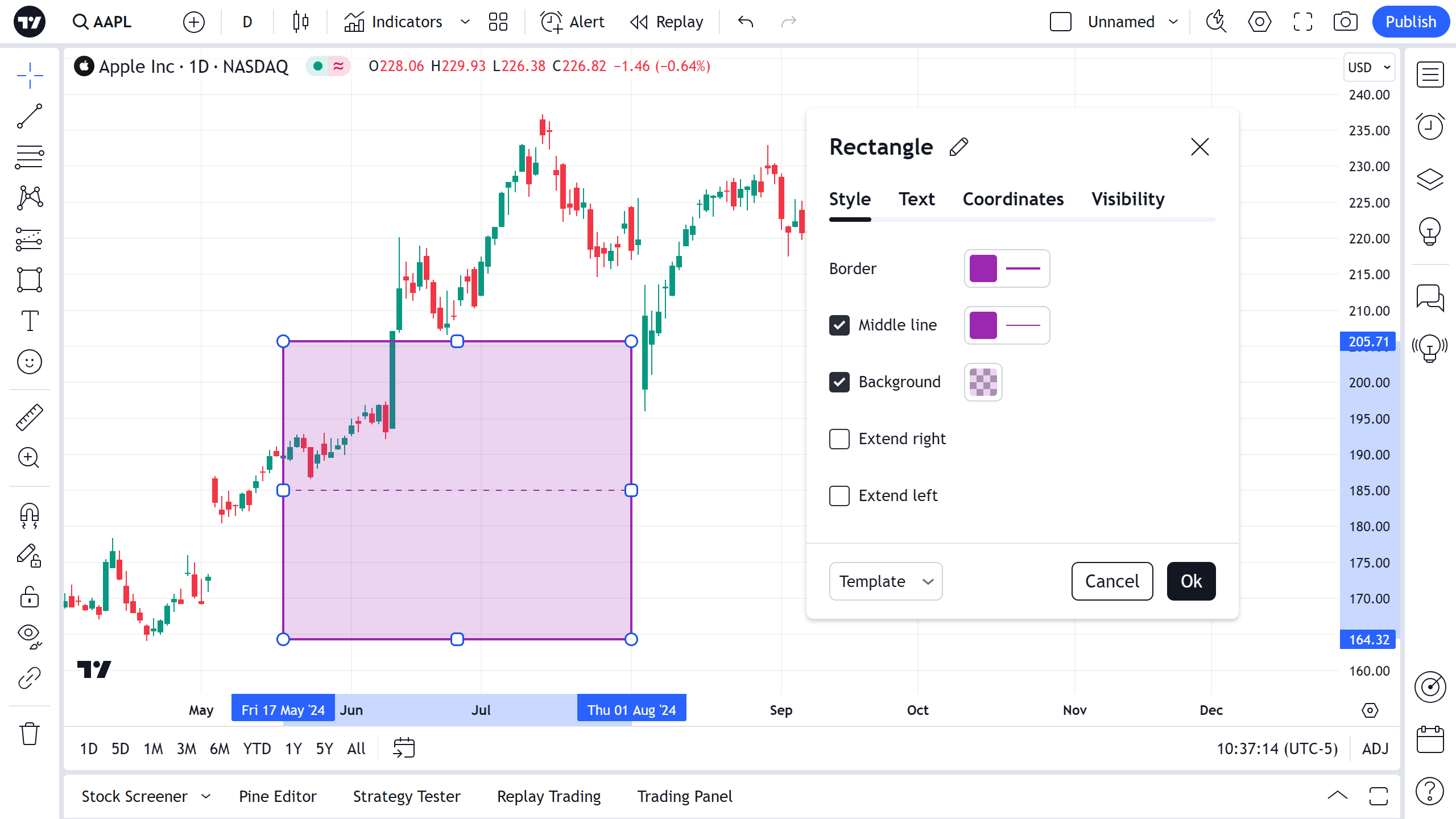 Im Einstellungsfenster (Tab „Koordinaten“) können Sie die Positionen der Rechteckpunkte auf einer Preisskala (indem Sie den Preis einstellen) und auf einer Zeitachse (indem Sie die Balkennummer einstellen) bestimmen.