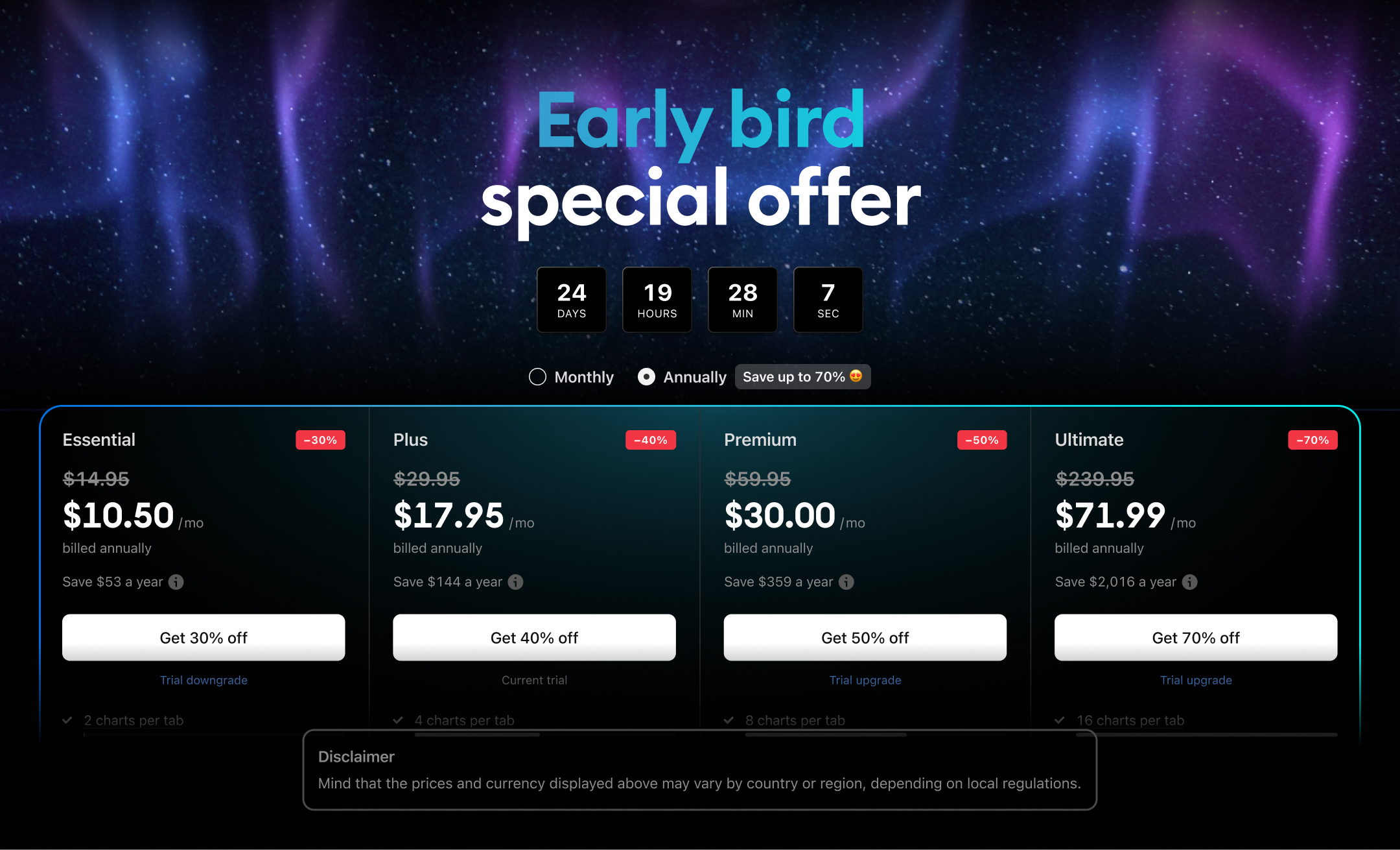 Bei TradingView glauben wir, dass eine Testphase pro Benutzer ausreicht, um das Konzept unserer Plattform zu verstehen und einen Vorgeschmack darauf zu bekommen, wie ein Abonnement aussehen würde. Wenn Sie ein anderes Abo ausprobieren möchten und Ihre Testphase noch nicht abgelaufen ist, dann können Sie Ihre Testversion von Essential auf Plus oder sogar Ultimate umstellen, indem Sie die folgenden Anweisungen befolgen.