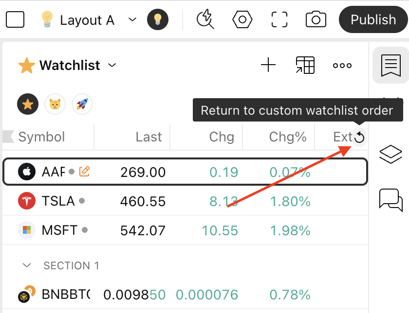 Klicken Sie auf die runde Pfeiltaste, um die vorherige Symbolreihenfolge zurückzubringen.