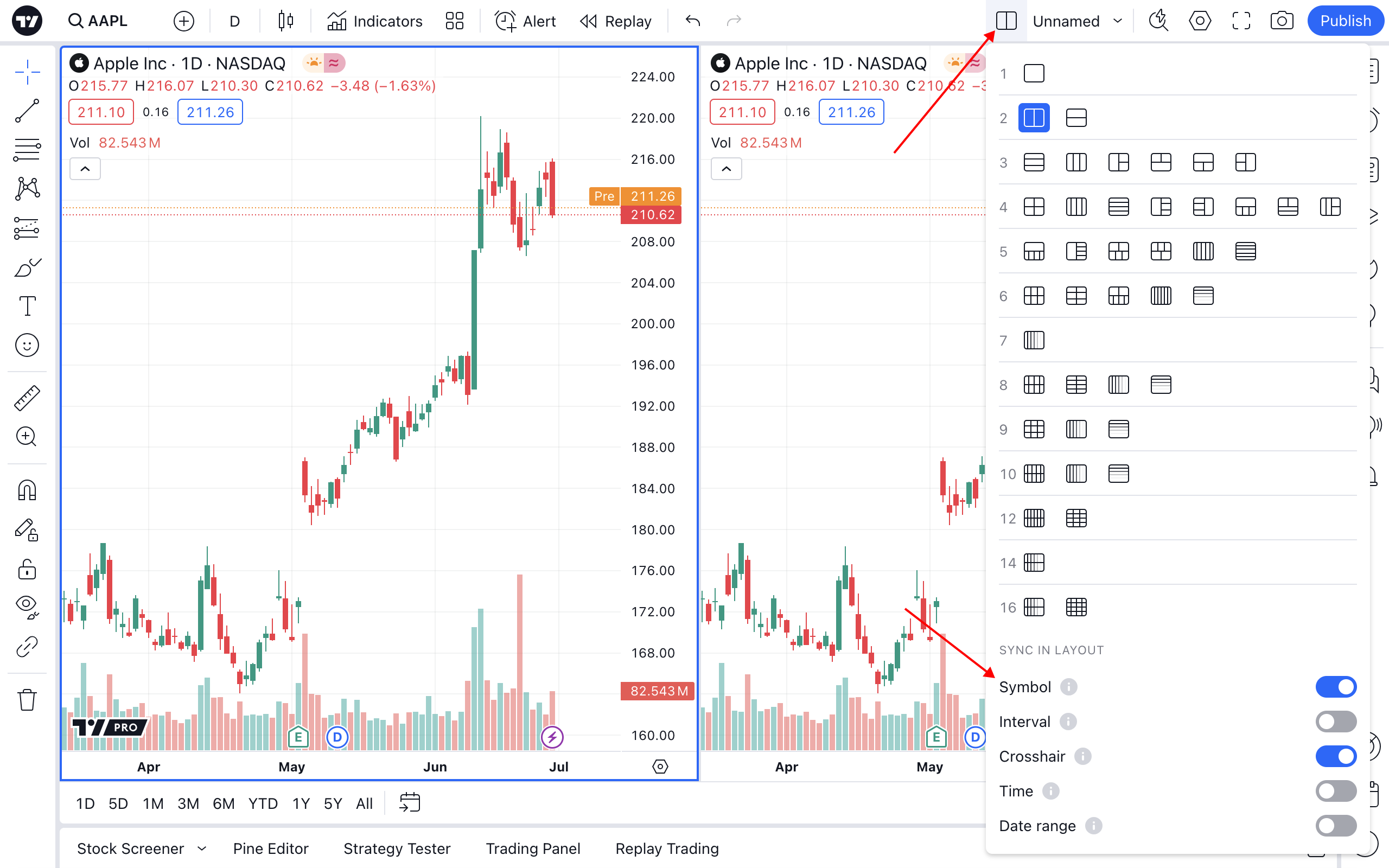 Sie können Ihre Charts im Multi-Chart-Layout synchronisieren, indem Sie die Schaltfläche "Layout auswählen" in Ihrer Hauptsymbolleiste anklicken und auswählen, welche Elemente Sie synchronisieren möchten. Sie haben die Möglichkeit, die folgenden Elemente Ihres Charts zu synchronisieren: Symbol, Fadenkreuz, Intervall, Zeit- und Datumsbereiche. Wenn Sie z. B. für beide Charts das gleiche Symbol verwenden möchten, müssen Sie "Symbol" wählen.