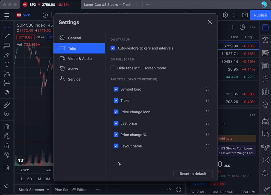 - Verknüpfen Sie Ticker in verschiedenen Chart-Tabs: Weisen Sie dieselbe Farbe verschiedenen Tabs zu, ändern Sie den Ticker in einem Tab und alle anderen Tabs werden dann auch dasselbe Symbol anzeigen.