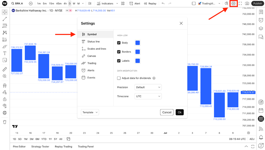 Verwenden Sie hierfür den Zahnradbutton in der oberen Symbolleiste und gehen Sie dann in den Tab „Symbol“.