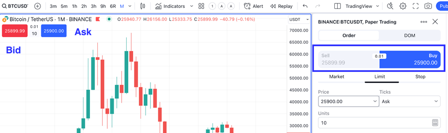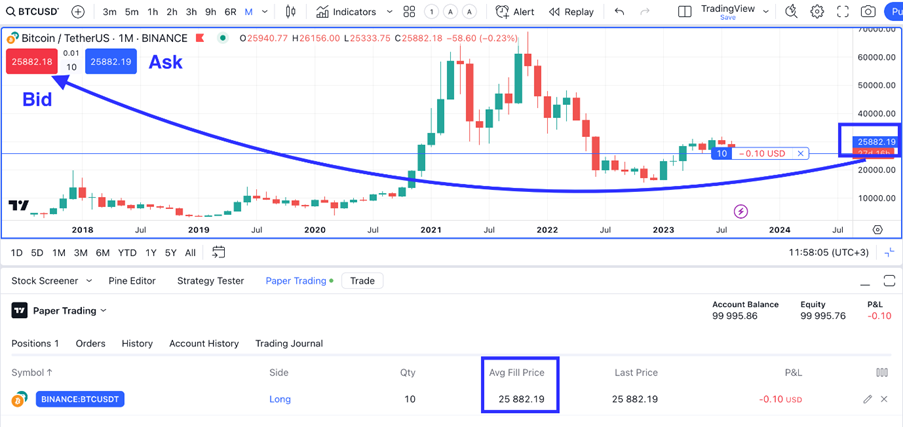 In den meisten Fällen werden Kauforder zu dem Ask-Preis und Verkaufsorder zu dem Bid-Preis ausgeführt. Der letzte Preis auf dem Chart wird für die Berechnung nicht berücksichtigt. Sie werden in dem Orderfeld und oben links auf den Buttons „Kaufen“ und „Verkaufen“ dargestellt.