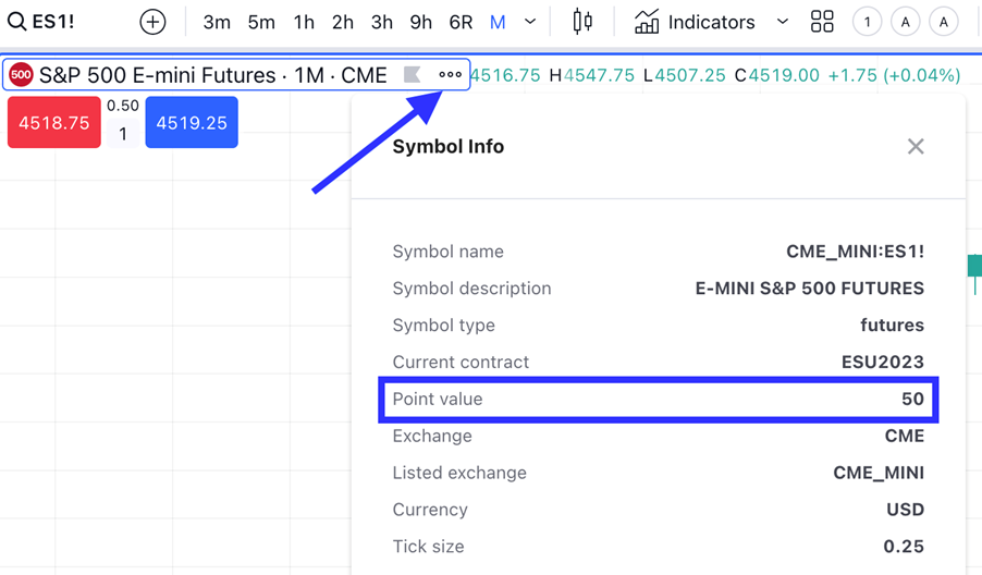 Die Formel für Terminkontrakte unterscheidet sich ein wenig, da hierbei auch der Punktwert des Kontrakts berücksichtigt wird. Dieser Datenpunkt ist in den Symbolinformationen im Ticker enthalten, klicken Sie einfach auf die drei Punkte in der Beschreibung.