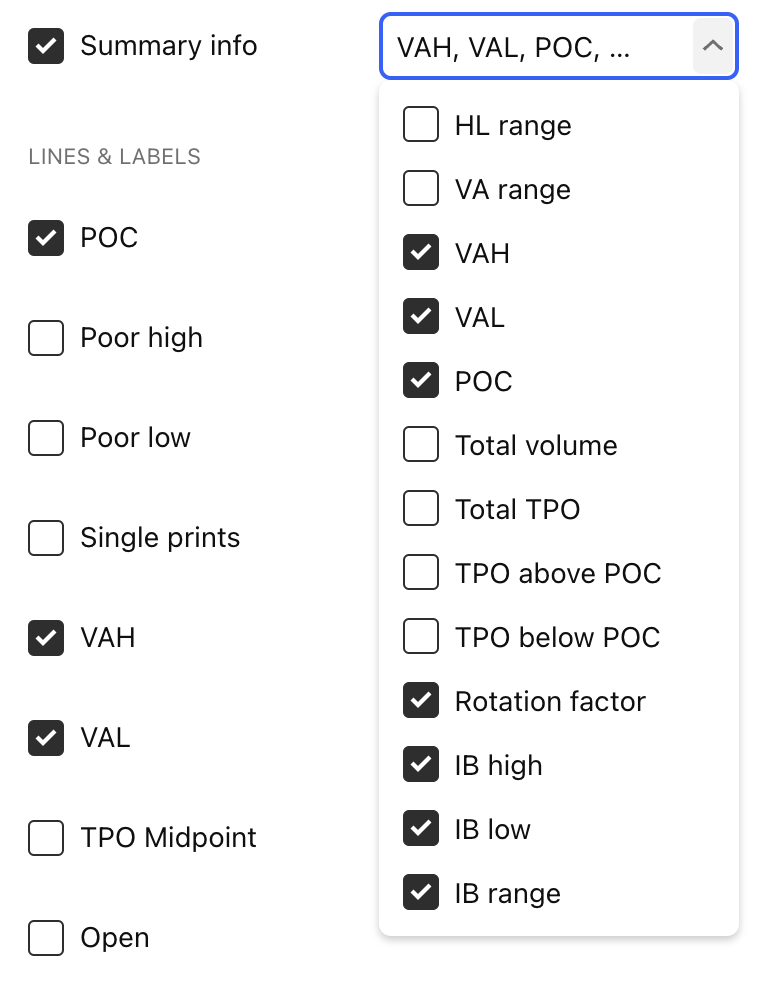 - VAL - hier können Sie die Sichtbarkeit der Linie für „Value Area Low“ und des Labels für den TPO-Zeitrahmen einstellen.