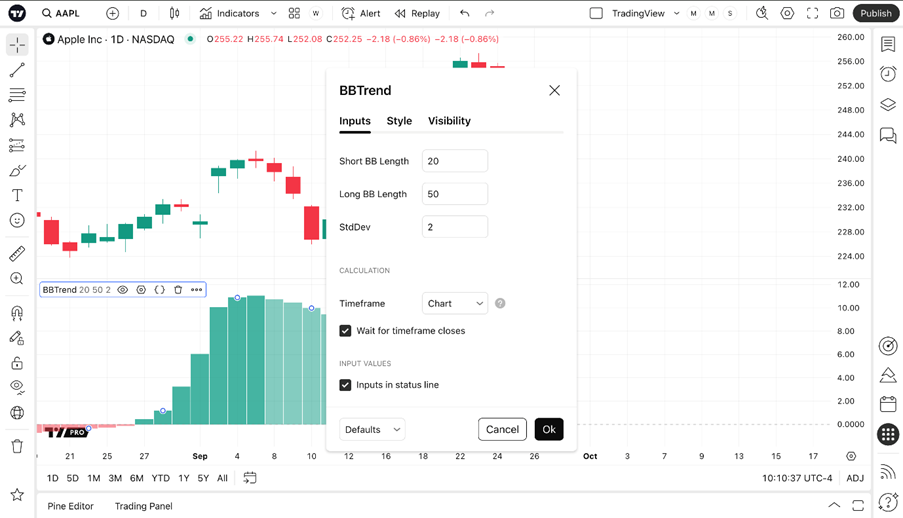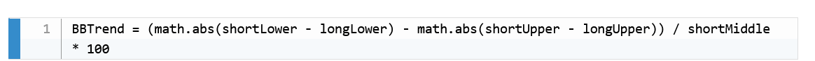 Die BBTrend-Berechnung basiert auf den Bändern von zwei unterschiedlichen Bollinger-Bändern, einem kurzen und einem langen. Die Formel ist:
