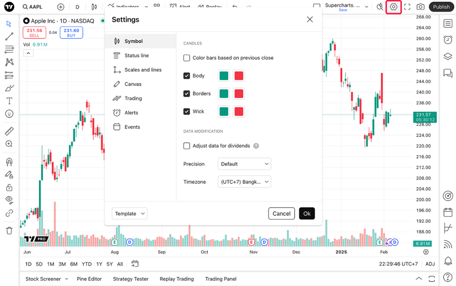Sie können die Kerzendiagramme auch entsprechend Ihren Wünschen und Bedürfnissen einstellen. Verwenden Sie hierfür den Button „Einstellungen“ in der oberen Symbolleiste, gehen Sie dann auf den Tab „Symbol“.