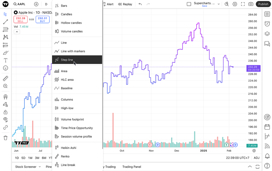 Wenn Sie sich in den Supercharts befinden, dann öffnen Sie in der oberen Symbolleiste das Charttyp-Menü und wählen Sie hier „Step-Line“ aus.