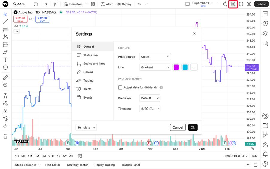 Sie können diesen Chart gemäß Ihren Bedürfnissen und Präferenzen einstellen. Klicken Sie hierfür in der oberen Symbolleiste auf die Einstellungen und gehen Sie auf den Tab „Symbol“.