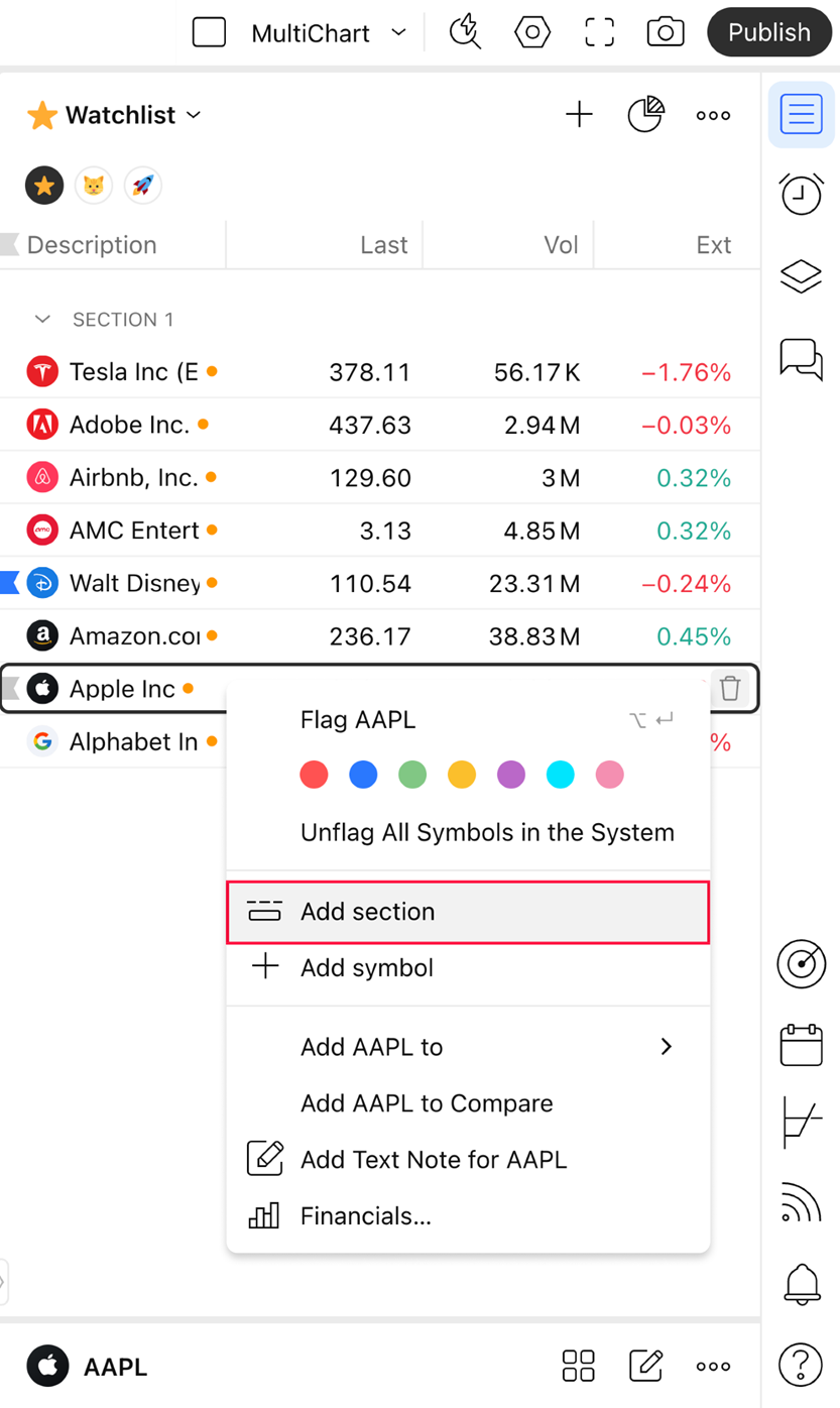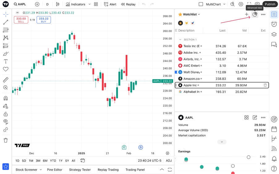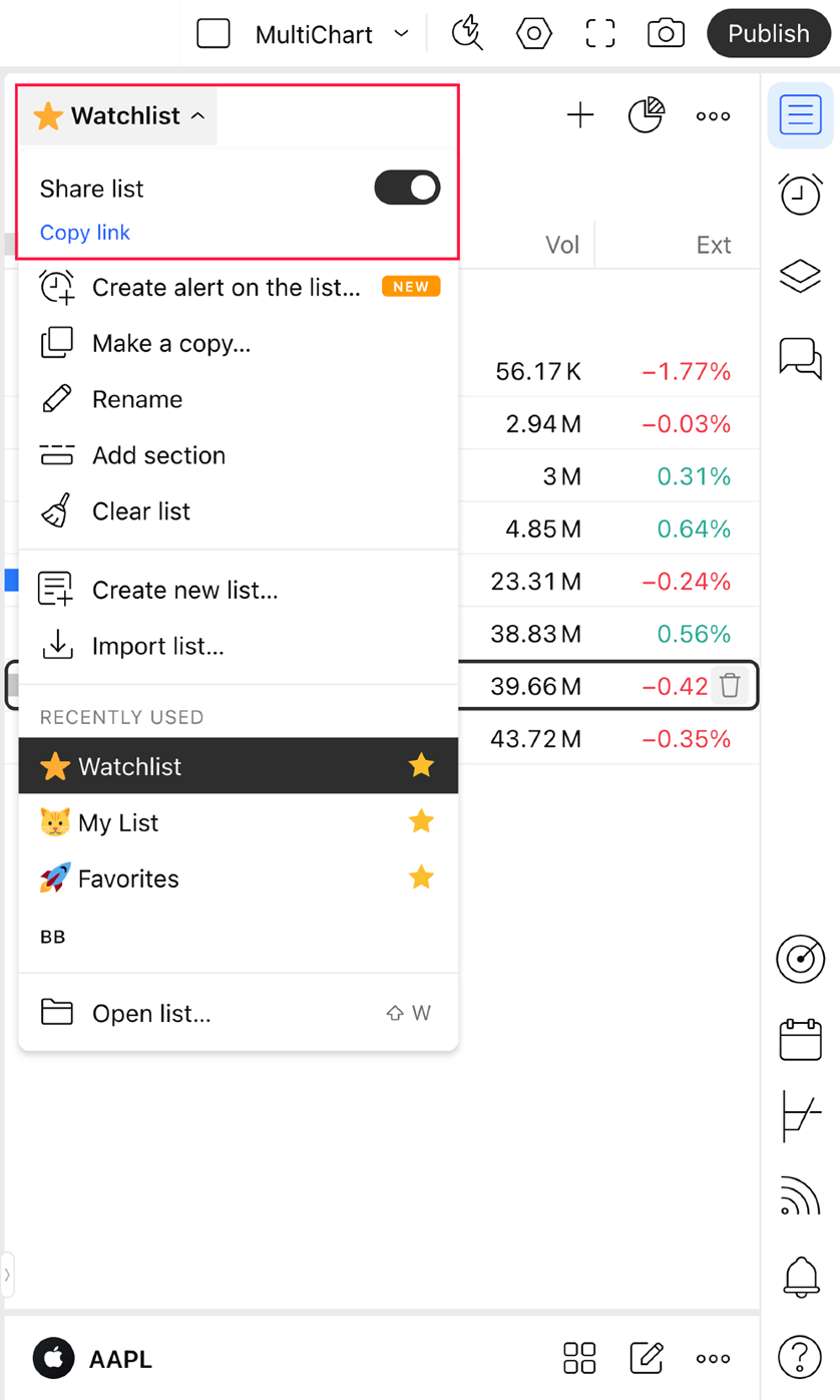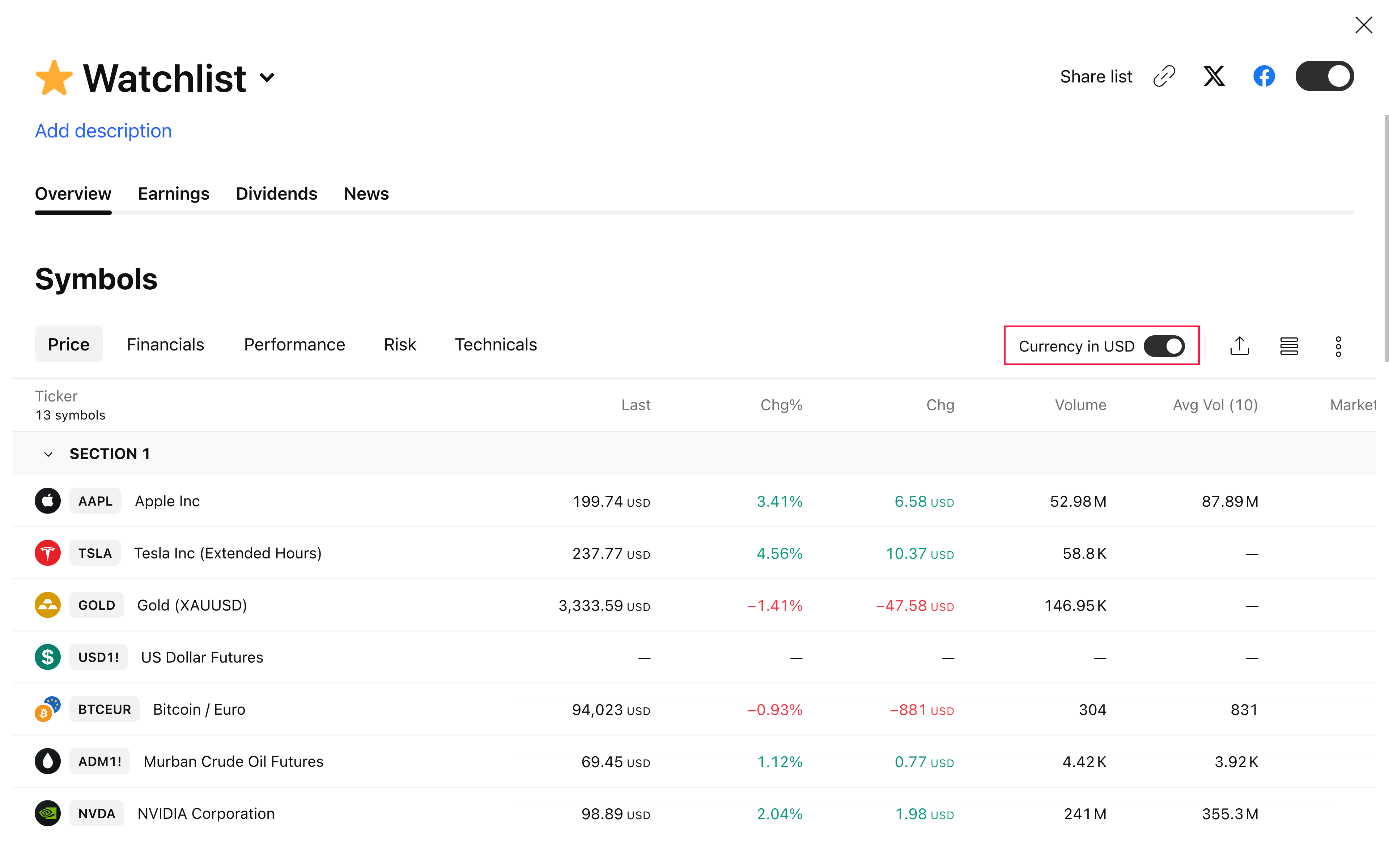 Die TradingView-Watchlisten können in der Symbolleiste rechts am Bildschirm geöffnet werden. Sie enthalten die wesentlichen Daten, einschließlich den neuesten Preis, die Preisveränderung und weitere Daten, welche Sie in den Einstellungen Ihren Bedürfnissen anpassen können.