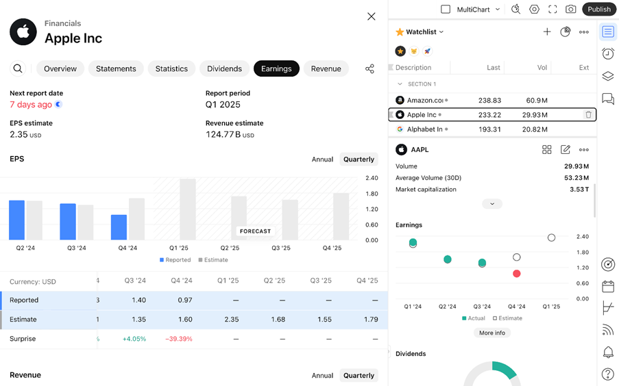 - Kalender für Dividenden und Erträge, auf diese Weise können Sie die anstehenden Berichte mitverfolgen und Ihre Strategien modifizieren.
