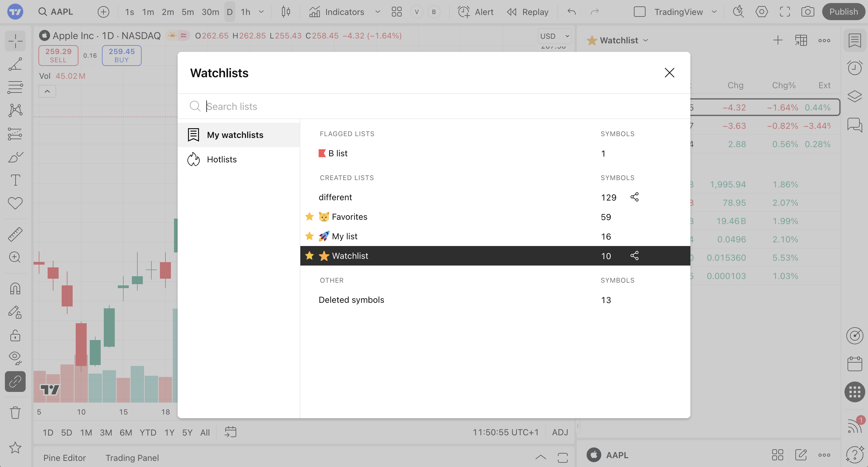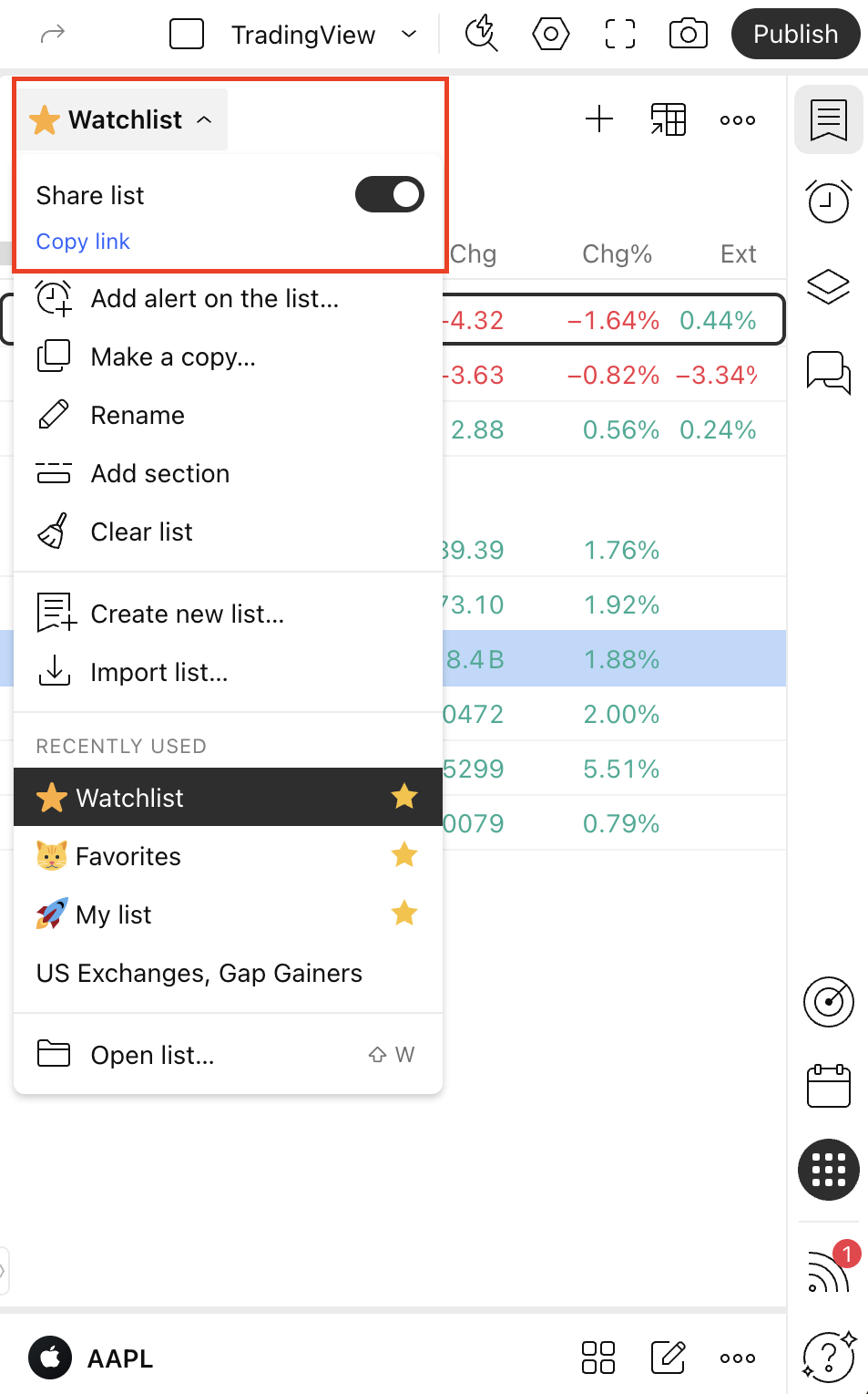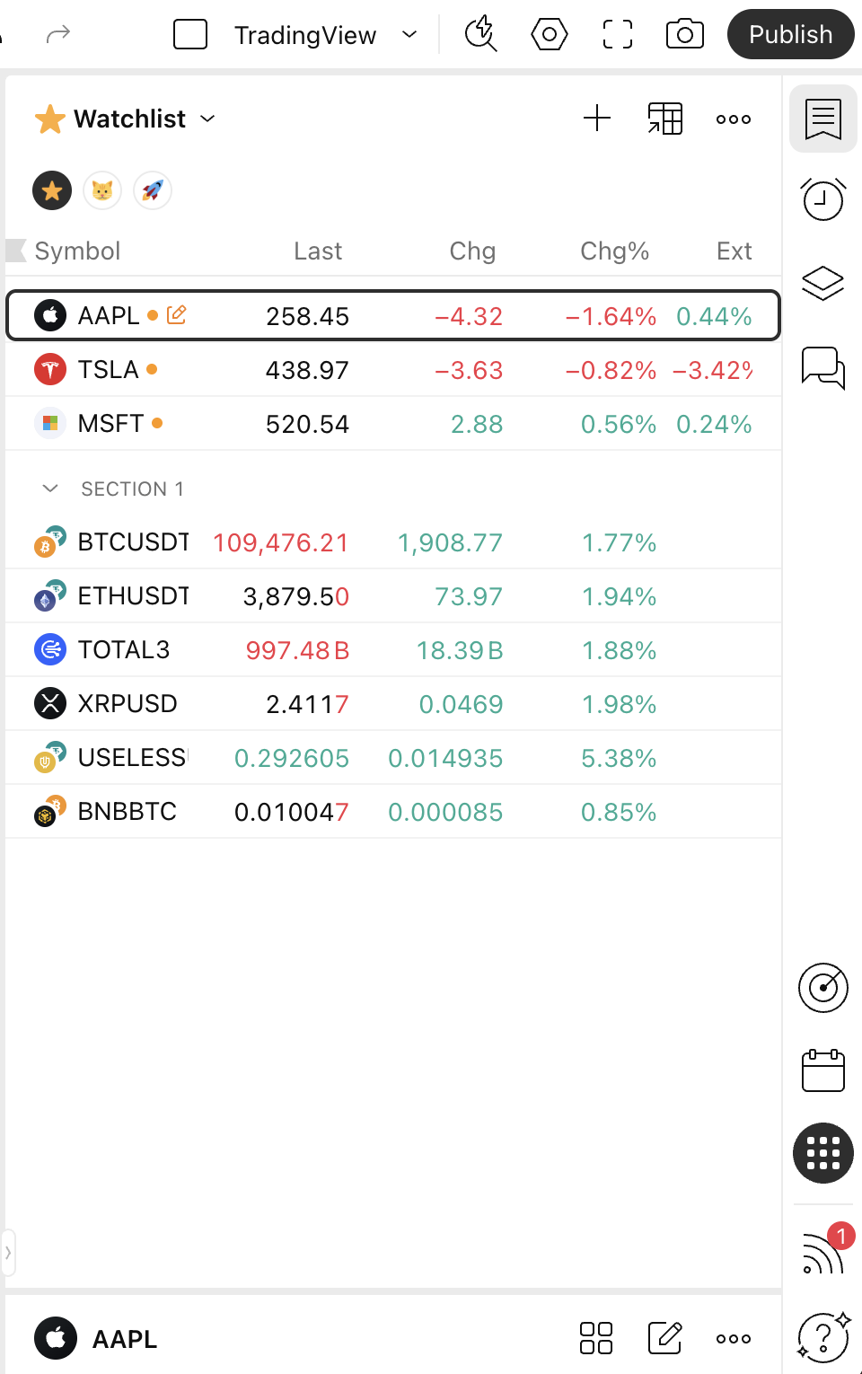 Die TradingView-Watchlisten können in der Symbolleiste rechts am Bildschirm geöffnet werden. Sie enthalten die wesentlichen Daten, einschließlich den neuesten Preis, die Preisveränderung und weitere Daten, welche Sie in den Einstellungen Ihren Bedürfnissen anpassen können.