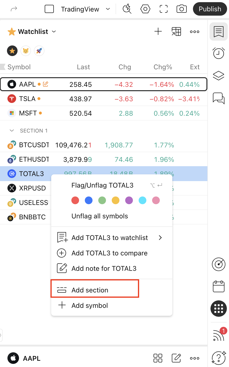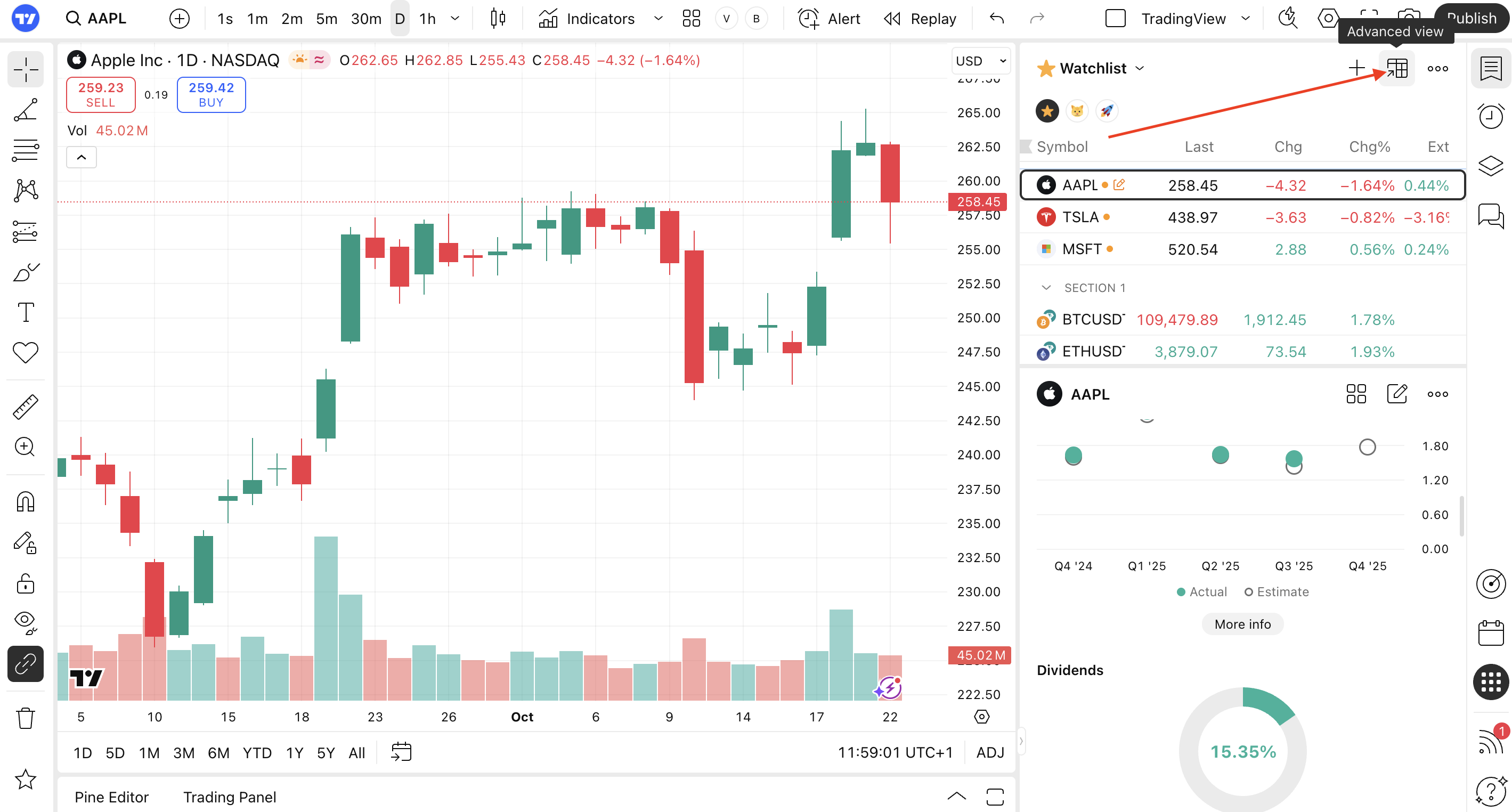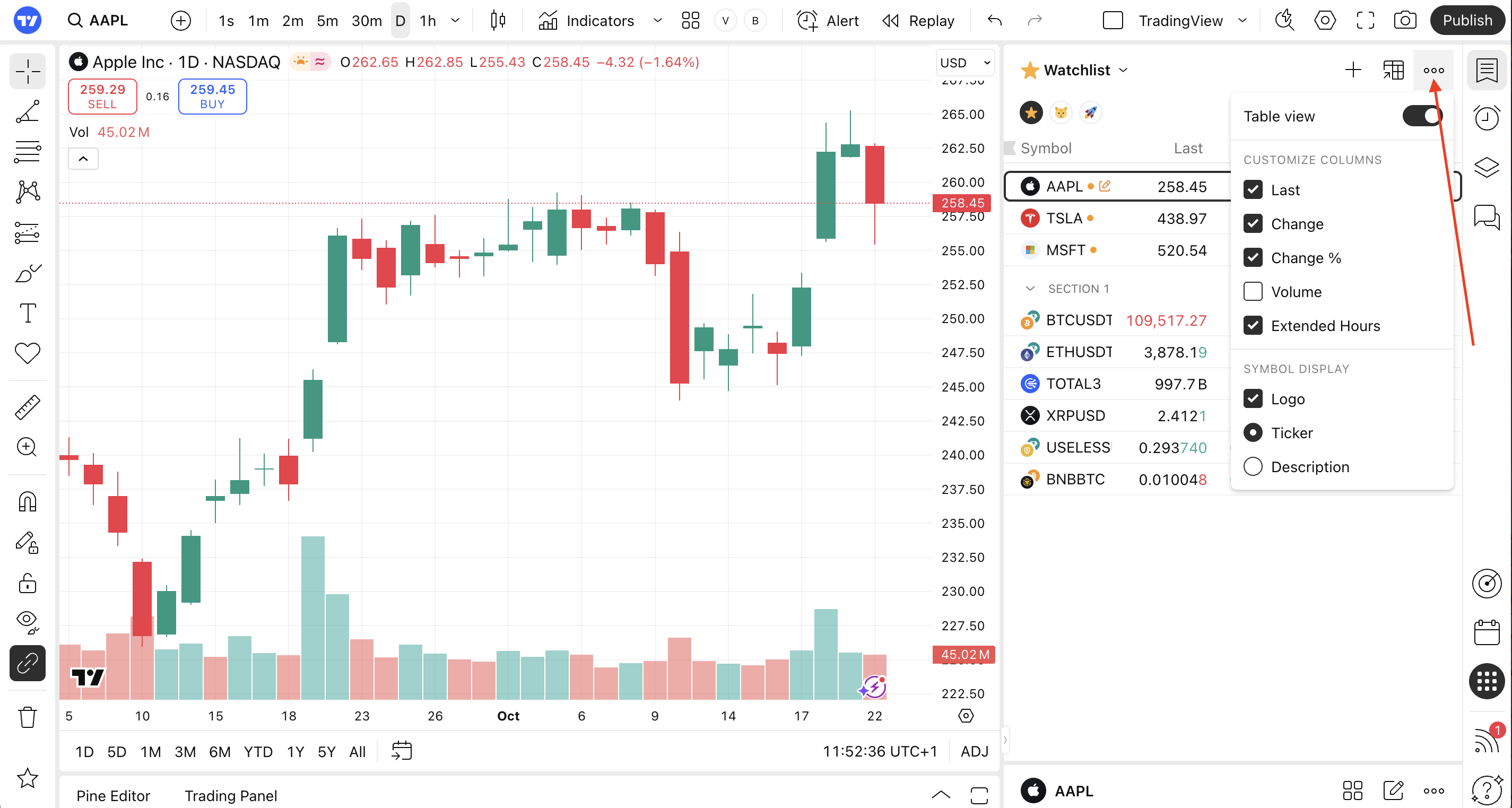Die TradingView-Watchlisten können in der Symbolleiste rechts am Bildschirm geöffnet werden. Sie enthalten die wesentlichen Daten, einschließlich den neuesten Preis, die Preisveränderung und weitere Daten, welche Sie in den Einstellungen Ihren Bedürfnissen anpassen können.
