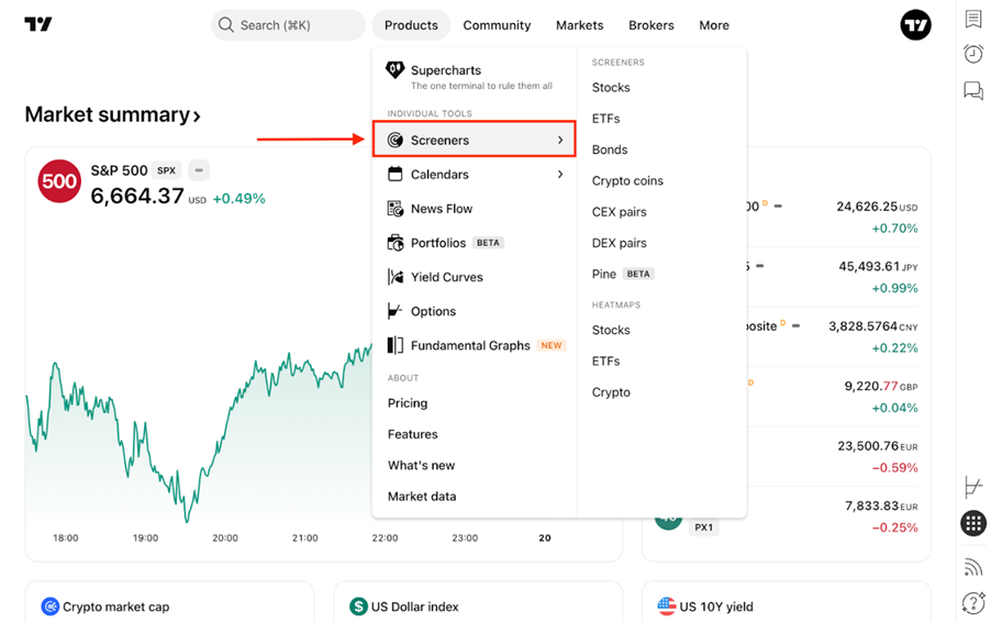 Klicken Sie auf „Produkte“, bewegen Sie den Mauszeiger über die Screener und wählen Sie dann „CEX-Paare“ aus.