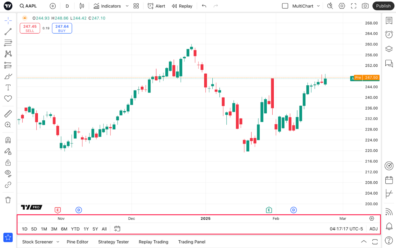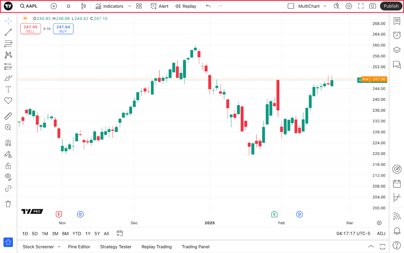 Es ist von wesentlicher Bedeutung, die Kapazitäten der TradingView-Supercharts zu verstehen, bevor Sie Ihre Analysen beginnen. Auf unseren Charts erhalten Sie Zugang zu technischen und Finanzdaten, den Ideen aus unserer Community und Informationen über wichtige Wirtschaftsereignisse. Sie können auch direkt auf unseren Supercharts mit Ihrem Broker traden.