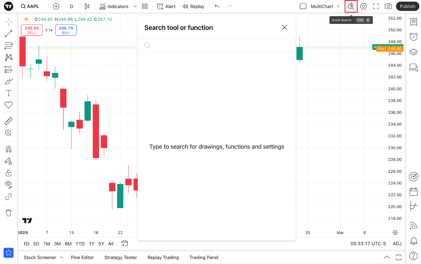 - Handelsfeld: Verbinden Sie sich mit Ihrem Broker und handeln Sie direkt auf dem Chart.