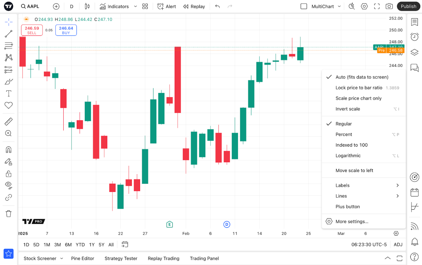Hier befindet sich auch ein Zahnrad-Button. Mit diesem Button können Sie die Einstellungen für die Preisskala öffnen und den Modus einstellen, welche Labels angezeigt werden sollen usw.