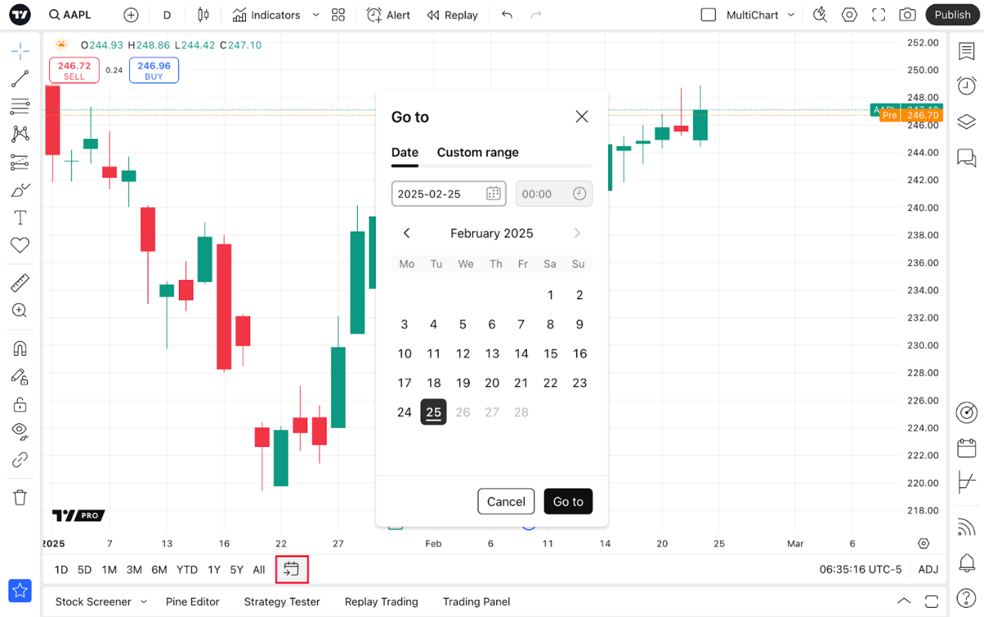 Unter der Zeitskala befinden sich die voreingestellten Intervalle für Ihren Bildschirm. Zum Beispiel: Wenn Sie „1D“ auswählen, dann wird der Chart so eingestellt, dass er einen Handelstag in einem 1-minütigen Intervall darstellt. Wenn Sie „Alles“ auswählen, dann werden alle verfügbaren Altdaten in einem monatlichen Intervall dargestellt. Wenn keins dieser Intervalle Ihren Bedürfnissen entsprechen sollte, dann können Sie auch ein bestimmtes Datum auswählen oder eine benutzerdefinierte Handelsspanne einstellen.