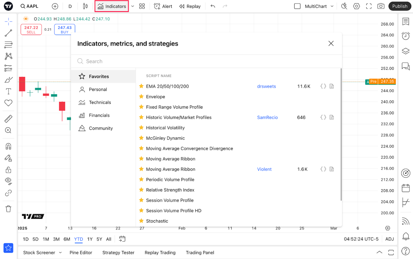 - Pine Editor: Hier können Sie einzigartige Indikatoren und Strategien im Pine Script® erstellen, verwalten, einem Chart hinzufügen und mit anderen Tradern teilen.