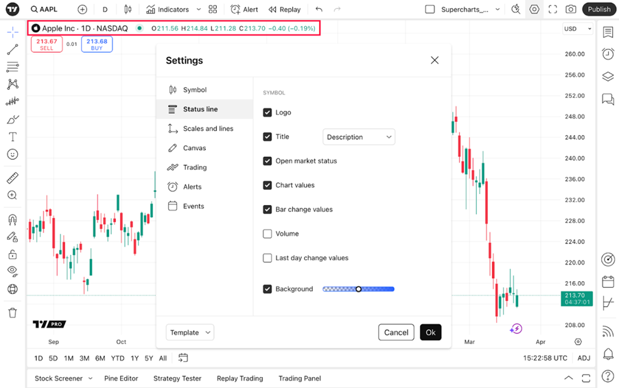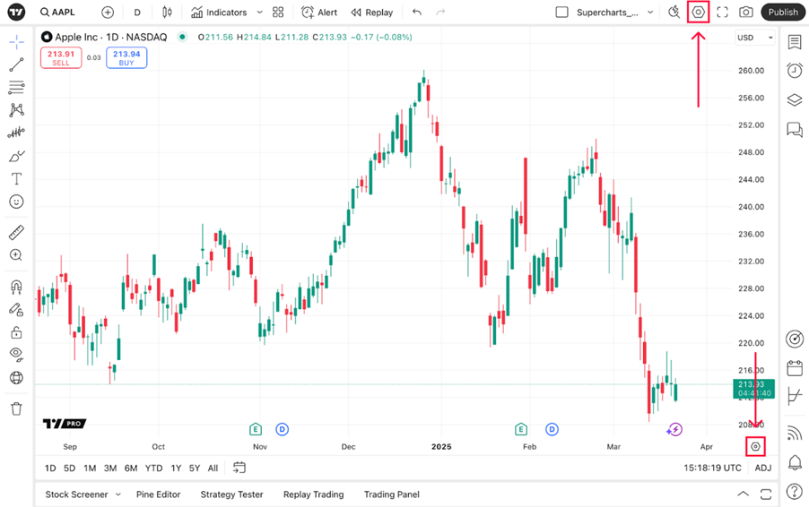 Klicken Sie hierfür auf den Zahnradbutton in der oberen Symbolleiste oder unten am Chart. Sie können die Einstellungen auch mit einem Doppelklick auf die Preislinie oder einen Balken öffnen.