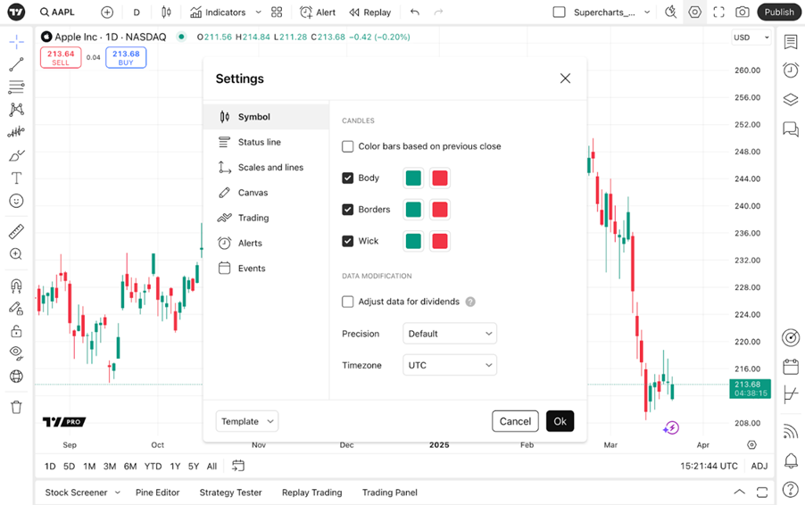 Hinweis: Die verfügbaren Charteinstellungen sind abhängig von dem verwendeten Charttyp und Symbol. Der Abschnitt für „Symbol“ verändert sich abhängig von dem verwendeten Chart, und Unternehmensevents wie Aktiensplits sind für Bitcoin natürlich unmöglich.