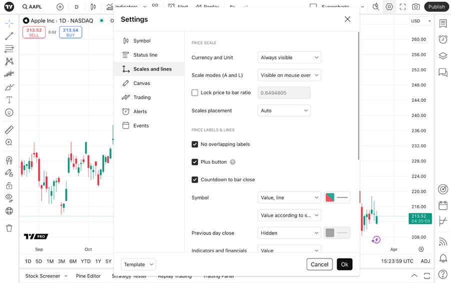 - Preisskala: Hier können Sie die Währung und Sichtbarkeit der Währungseinheit einstellen, so wie auch den Skala-Modus, das Verhältnis Kurs-zu-Balken fixieren und die Position bestimmen.