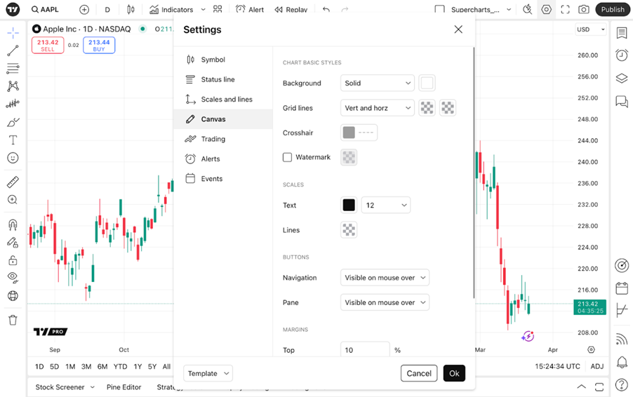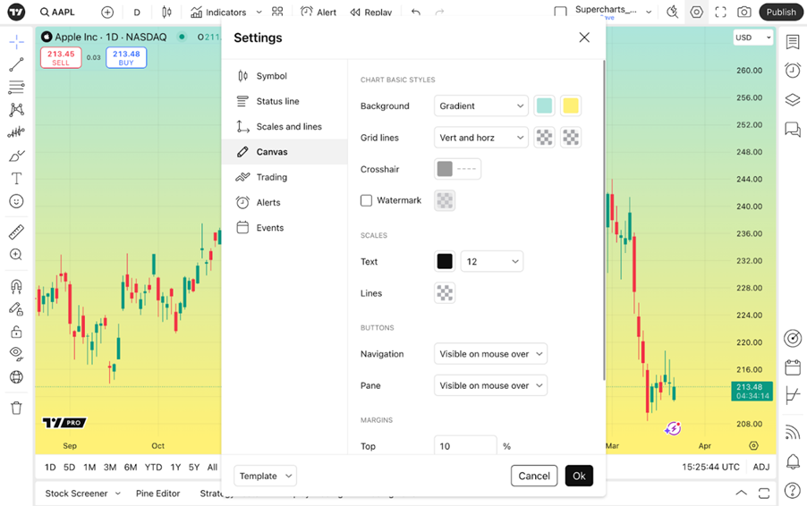 Innerhalb der Charteinstellungen können Sie unsere Charts so konfigurieren, dass sie genau Ihrem Handelsstil entsprechen. Hier können Sie das Aussehen, den Typ, die grafischen Elemente, Preisskala und mehr verändern.