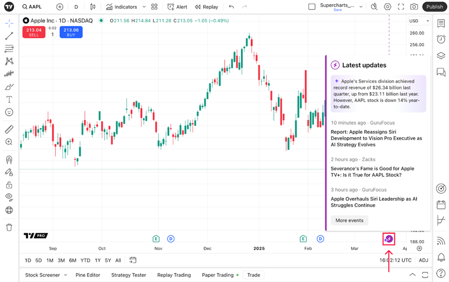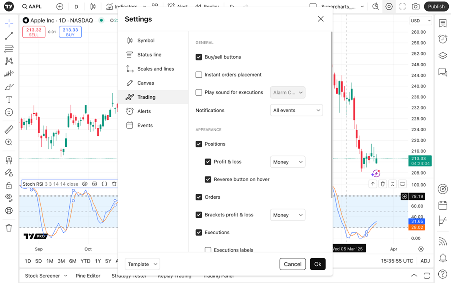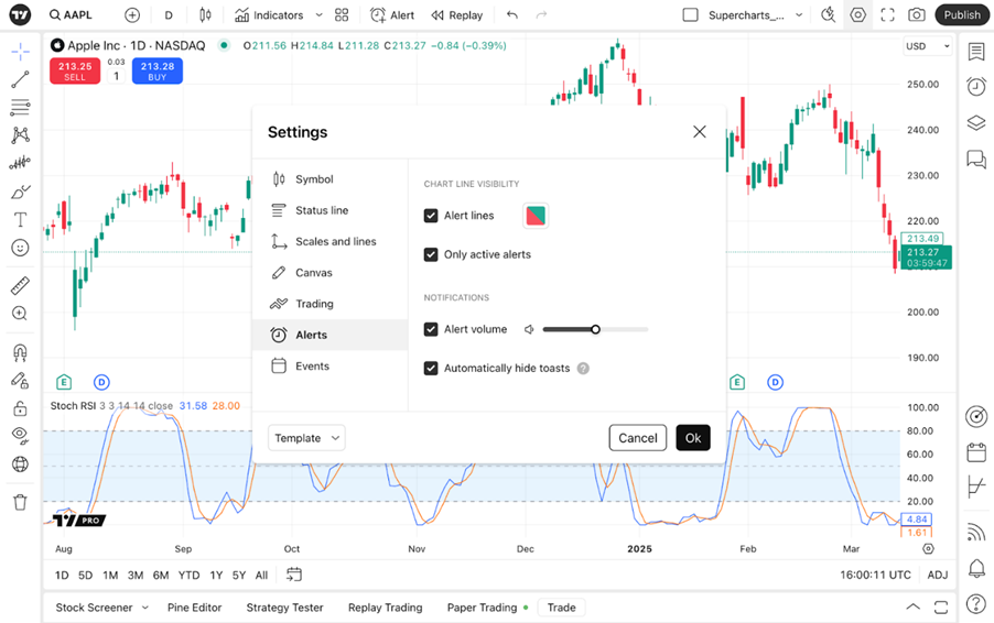 Hier können Sie einstellen, wie Ihre Alarme auf dem Chart dargestellt werden. Diese Einstellungsoptionen umfassen nur das Erscheinungsbild. In unserer Wissensbasis können Sie mehr über die TradingView-Alarme und ihre Funktionsweise erfahren.