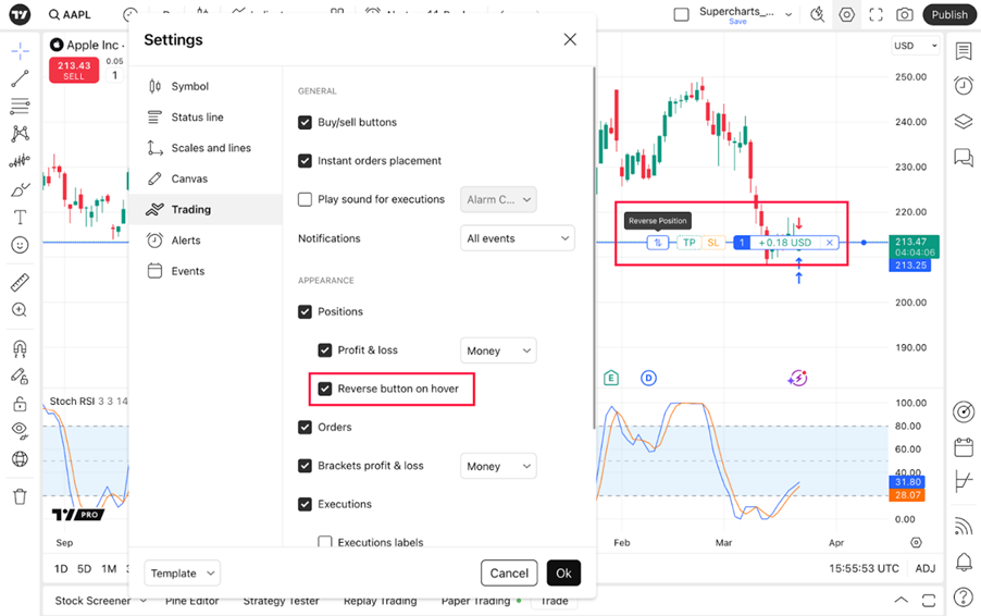 Hier befindet sich auch die Option Umkehrbutton anzeigen, dieser wird dann erscheinen, wenn Sie den Cursor über der Preisveränderung platzieren. Auf diese Weise können Sie dann unverzüglich Ihre Position umkehren. Diese Funktion ist nützlich für Märkte mit einer hohen Volatilität und Scalping-Strategien, wenn Sie nicht genug Zeit haben, um eine Order auszufüllen und diese sofort ausführen möchten.