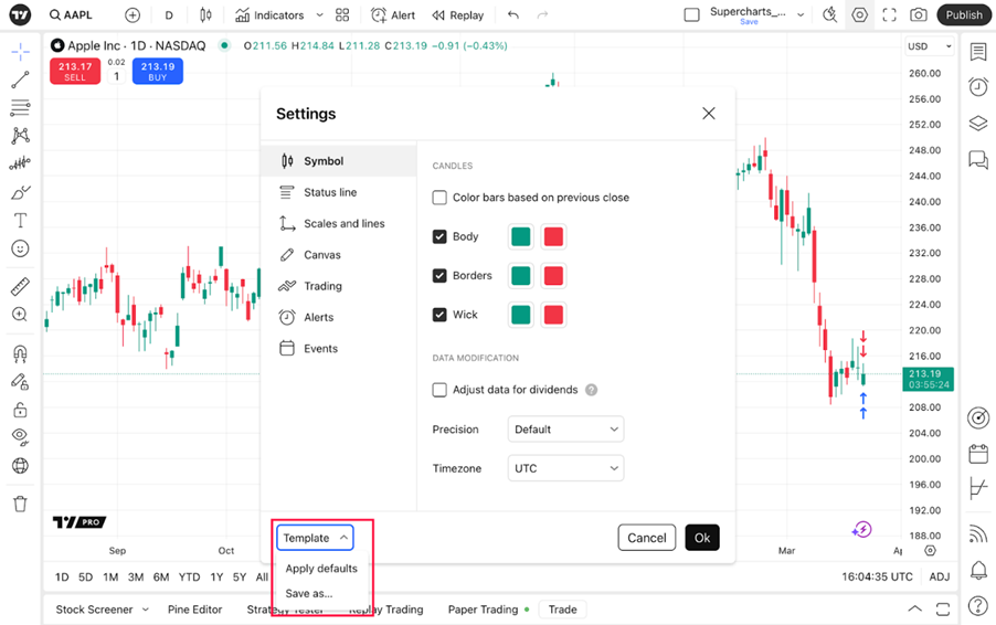 - Sie können auch die Zeitzone auswählen. Sie können hierbei eine bestimmte Zeitzone einstellen oder „Börse“ verwenden (dies verwendet die Zeitzone der Börse).