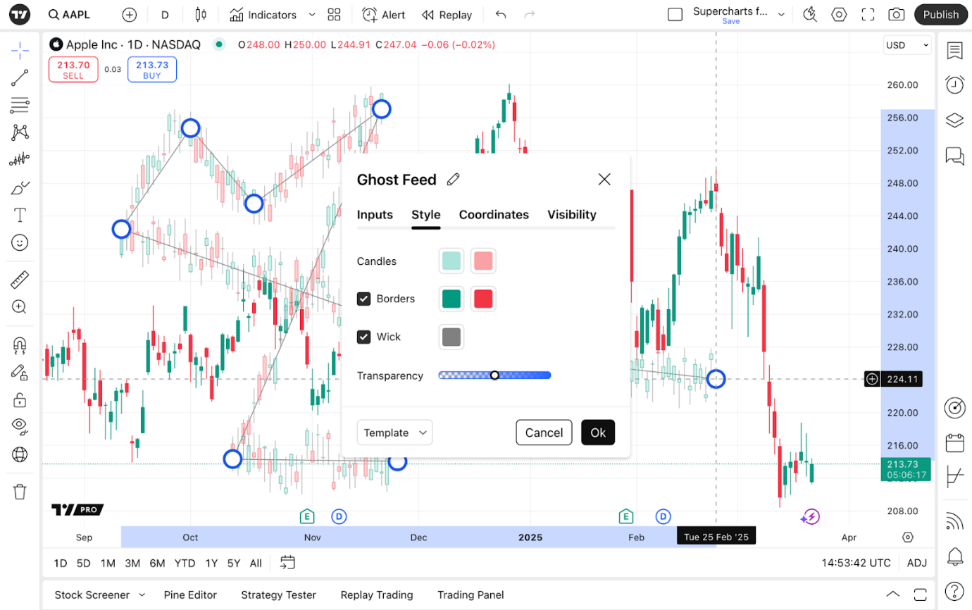 - Sie können den Ghost-Feed auch Klonen und Kopieren. Sie können ihn dann auch auf anderen Charts mit anderen Symbolen verwenden — hierbei werden alle Einstellungen beibehalten.
