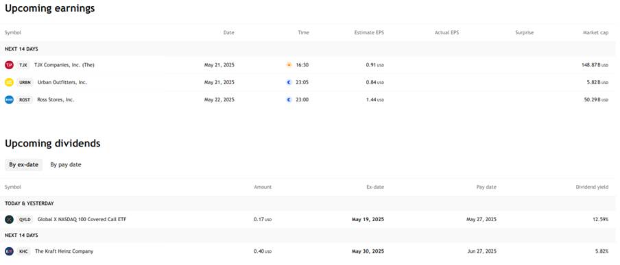 Hier wird eine Liste der Aktien mit anstehenden Dividendenevents angezeigt. Sie können diese Liste auf zwei Weisen filtern lassen: nach dem Ex-Datum oder Zahlungstag. Wenn Sie eine dieser Optionen auswählen, dann wird eine Tabelle mit den folgenden Spalten erstellt: