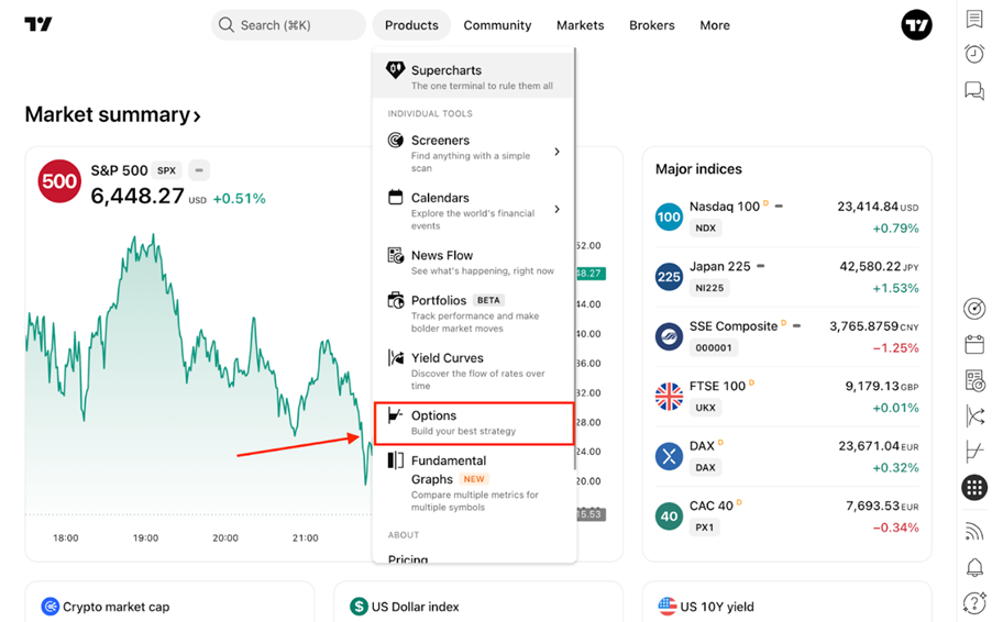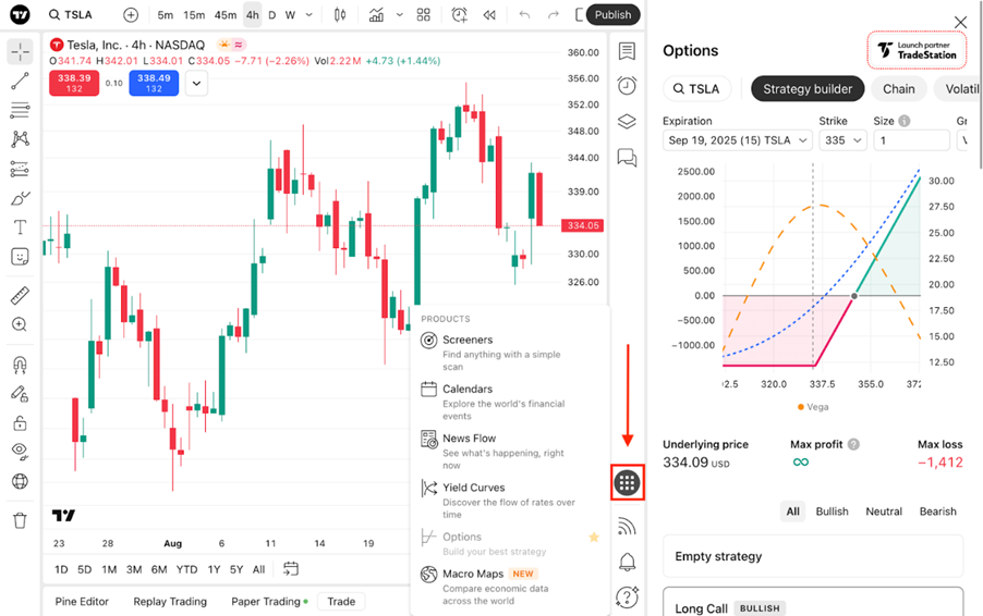Sie können auch die rechte Symbolleiste für den Zugang zu den Optionsketten verwenden. Auf diese Weise können Sie zum Beispiel gleichzeitig eine Aktie analysieren und sich die enthaltenen Optionen ansehen.