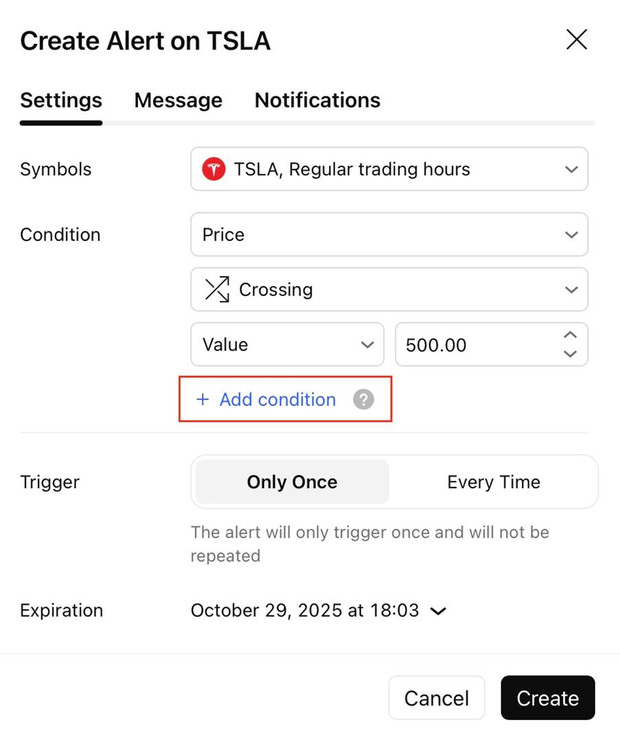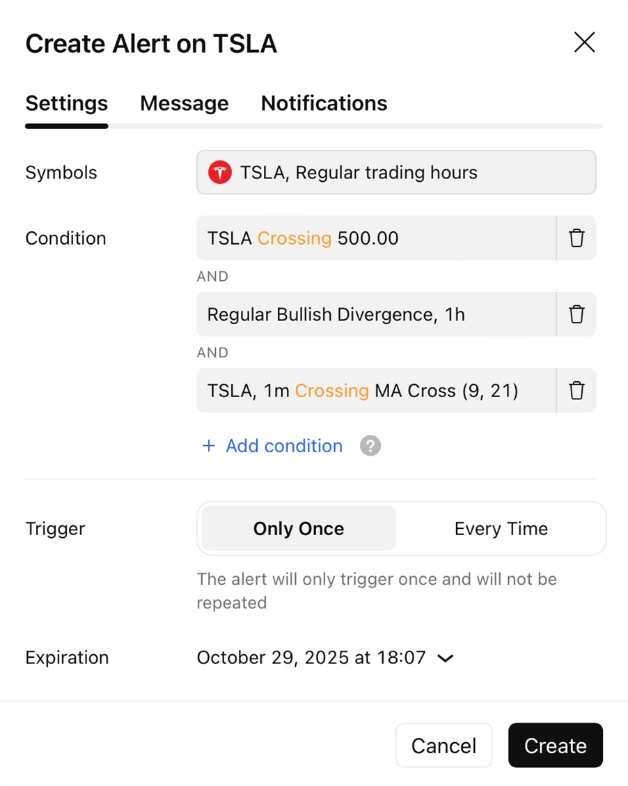 Sie können einen Alarm einstellen, der gleichzeitig mehrere Bedingungen prüft. Erstellen Sie schlauere und präzisere Signale, ohne eine einzige Codezeile schreiben zu müssen. Mit diesem Feature können Sie bis zu 5 unterschiedliche Bedingungen in 1 Alarm kombinieren – inklusive: Preise, Zeichnungen und Indikatoren. Dieser Alarm wird dann nur ausgelöst, wenn alle Bedingungen gleichzeitig erfüllt werden.