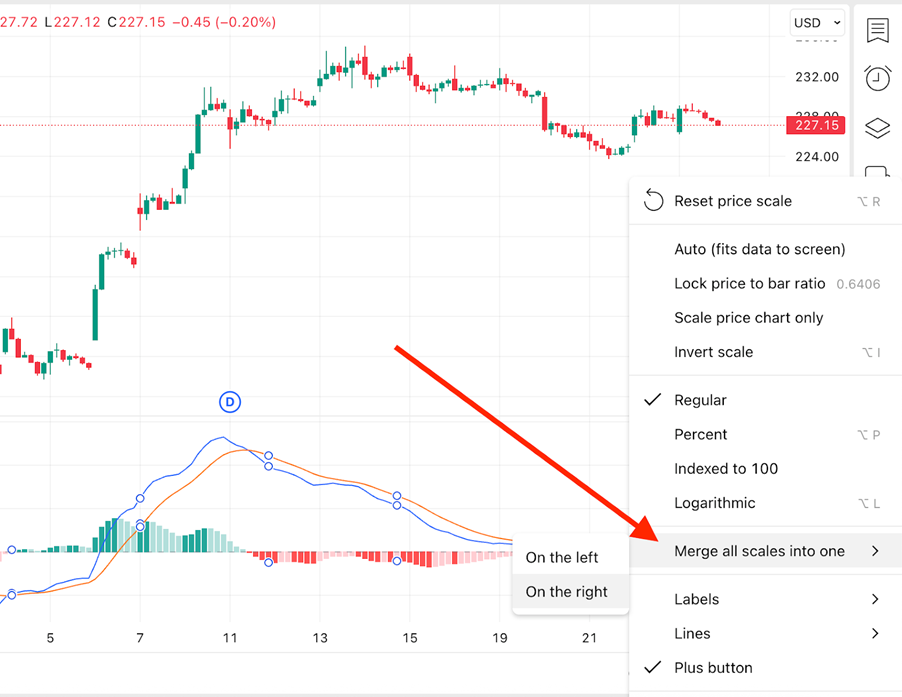 Verwenden Sie hierfür einen Rechtsklick auf der Preisskala und wählen Sie dann „Alle Skalen in eine zusammenfügen“ aus.