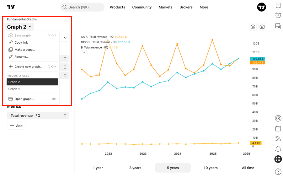 Die Fundamentalgraphen sind ein Tool für die Visualisierung von Finanzdaten auf Ihrem Chart. Sie können auf diese Weise mehrere Assets untereinander vergleichen. Wählen Sie hierfür einfach die finanzielle Metrik aus, welche Sie sich in einem Zeitverlauf ansehen möchten.