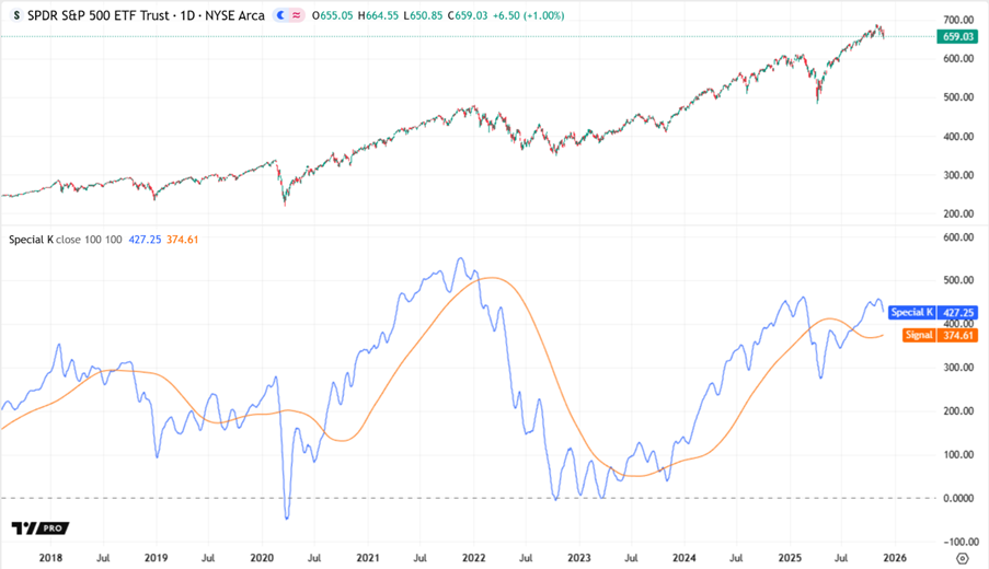 Der „Special K“ ist eine gewichtete Summe von Simple Moving Averages (SMAs) der Rate of Change (ROC) des Marktpreises zu mehreren Rückblicklängen. Pring hat hierbei das Gewicht und die Rückblicklänge für jede durchschnittliche ROC auf seinen Observationen der Marktzyklen und Trends basiert. Diese Summe kombiniert die folgenden Werte: